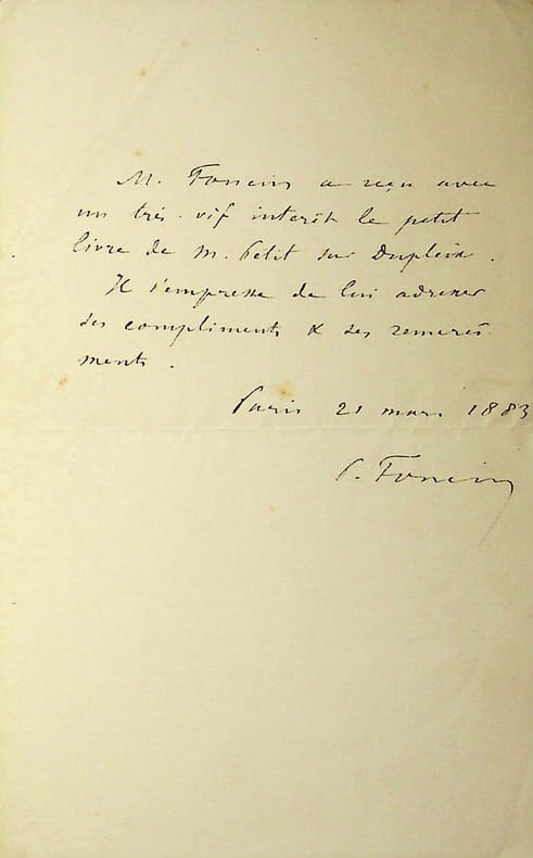 Pierre Foncin (1841-1916), historien, géographe, professeur. L.A.S., Paris, 21 mars 1883, 1p in-8. A l'historien et sociologue Edouard Petit (1858-1917). Remerciements pour l'envoi de son livre sur Dupleix. [475]