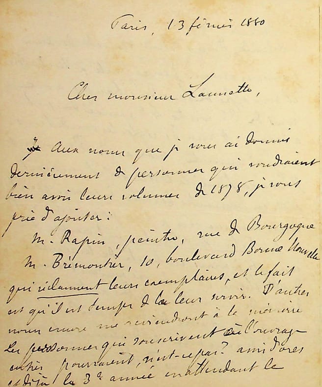Mario Proth (1832-1891), écrivain, journaliste. L.A.S., Paris, 13 février 1880, 2p 1/4 in-12. Au libraire Henri Launette (1845-1894), alors employé par Ludovic Baschet. Il donne des noms de personnes désirant avoir le 3e volume de son Voyage au pays des peintres. Il cite notamment le peintre Alexandre Rapin. Il espère une seconde édition des 2 premiers volumes. [475]