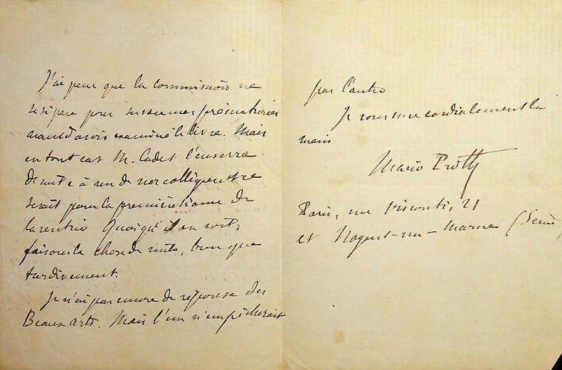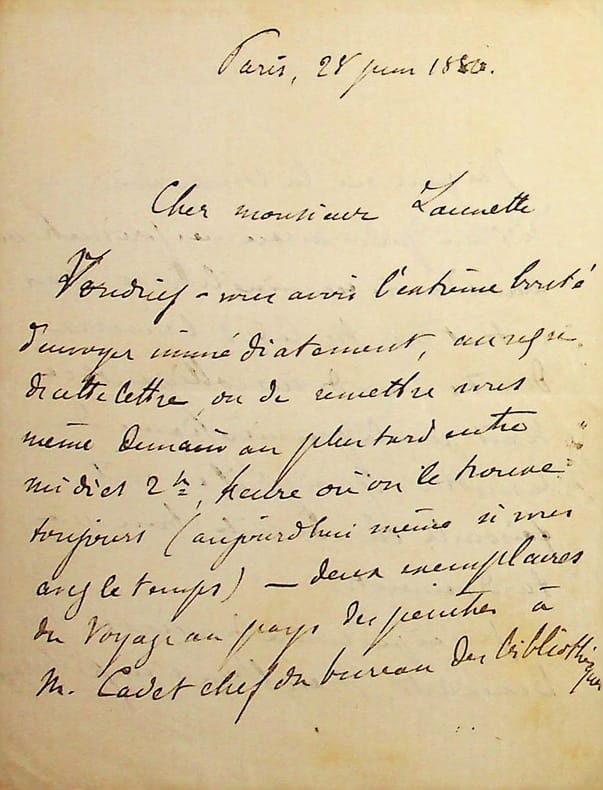 Mario Proth (1832-1891), écrivain, journaliste. L.A.S., Paris, 28 juin 1880, 2p 1/2 in-12. Au libraire Henri Launette (1845-1894), alors employé par Ludovic Baschet. Il souhaite que M. Cadet, « chef du bureau des bibliothèques », ait pour le lendemain deux exemplaires de son Voyage au pays des peintres. [475]
