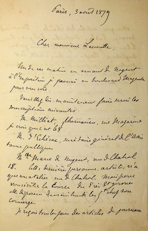 Mario Proth (1832-1891), écrivain, journaliste. L.A.S., Paris, 3 août 1879, 2p 1/2 in-8. Au libraire Henri Launette (1845-1894), alors employé par Ludovic Baschet. Il donne les noms de 3 nouveaux souscripteurs pour son Voyage au pays des peintres et signale la bonne réception à l'étranger de son ouvrage. [475]