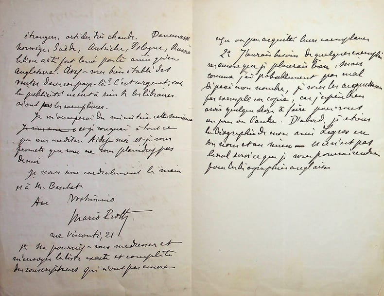 Mario Proth (1832-1891), écrivain, journaliste. L.A.S., Londres, 7 juillet 1879, 3p in-8. Au libraire Henri Launette (1845-1894), alors employé par Ludovic Baschet. Il se plaint du retard de publication de son livre Voyage au pays des peintres, parle de la réception à l'étranger (et à Londres), de la perception des souscriptions, etc. Intéressante lettre autour de son ouvrage. [475]