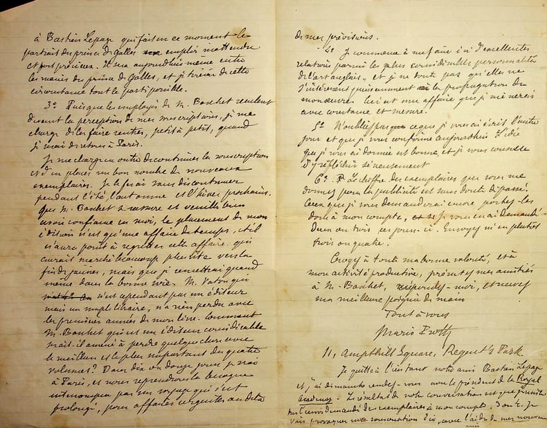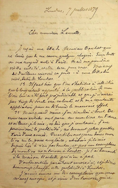 Mario Proth (1832-1891), écrivain, journaliste. L.A.S., Londres, 7 juillet 1879, 3p in-8. Au libraire Henri Launette (1845-1894), alors employé par Ludovic Baschet. Il se plaint du retard de publication de son livre Voyage au pays des peintres, parle de la réception à l'étranger (et à Londres), de la perception des souscriptions, etc. Intéressante lettre autour de son ouvrage. [475]