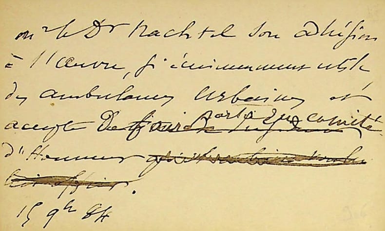 Charles Brun (1821-1897), ingénieur de la Marine nationale, sénateur. C.A., 15 septembre 1884, 5 lignes. Au docteur Henri Nachtel, à l'origine des ambulances publiques. Charles Brun « s'empresse d'envoyer à Mr le Dr Nachtel son adhésion à l'oeuvre, si éminemment utile des ambulances urbaines et accepte de faire partie du comité d'honneur ». [475]