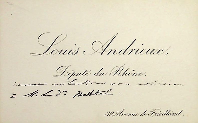 Louis Andrieux (1840-1931), homme politique, député du Rhône. C.A., sd, 2 lignes. Au docteur Henri Nachtel, à l'origine des ambulances publiques. « Donne volontiers son adhésion à M le Dr Nachtel ». [475]