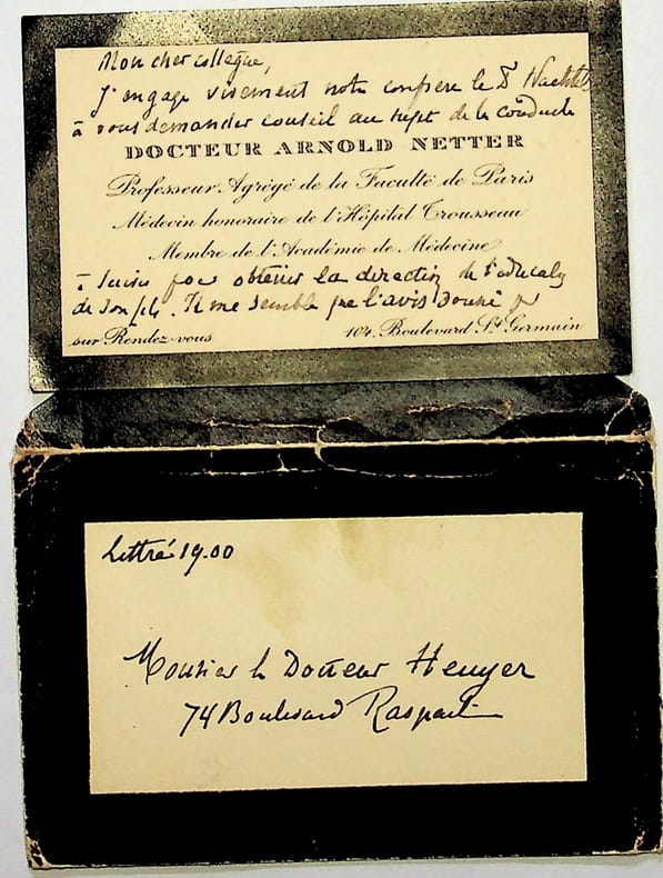 Arnold Netter (1855-1936), médecin, hygiéniste, pédiatre, biologiste. C.A.S., 17 mai 1929, 6 lignes. Au docteur Georges Heuyer (1884-1977), fondateur de la pédopsychatrie. « Mon cher collègue, j'engage vivement notre confrère le Dr Nachtel à vous demander conseil au sujet de la conduite à suivre pour obtenir la direction de [mot illisible] de son fils. Il me semble que l'avis donné par l'avocat est le meilleur. affectueusement à vous. ANetter ». [475]