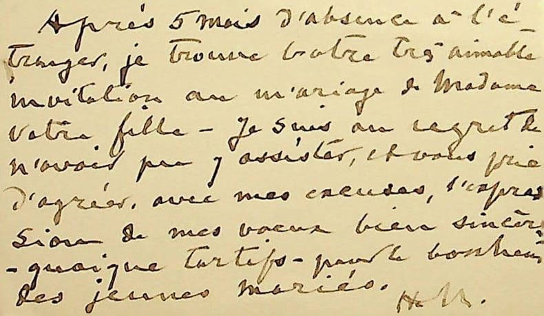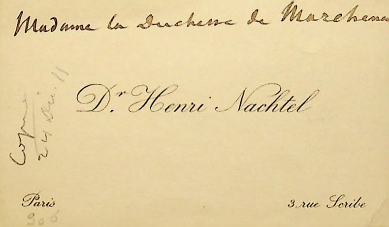 Henri Nachtel (XIXe-XXe), médecin à l'origine de services d'ambulances publiques. C.A.S. « H.N. », sd, 9 lignes. A la duchesse de Marchena (jamais envoyée, provient des papiers de Nachtel) : « Après 5 mois d'absence à l'étranger, je trouve votre très aimable invitation au mariage de madame votre fille. Je suis au regret de n'avoir pu y assister, et vous prie d'agréer, avec mes excuses, l'expression de mes voeux bien sincères - quoique tardifs - pour le bonheur des jeunes mariés. H.N. ».