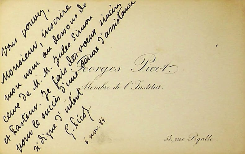 Georges Picot (1838-1909), juriste, historien, philanthrope. C.A.S., 6 novembre 1884, 4 lignes. Au docteur Henri Nachtel, à l'origine des ambulances publiques. « Vous pouvez, monsieur, inscrire mon nom au dessous de ceux de MM Jules Simon et Pasteur. Je fais des voeux sincères pour le succès d'une oeuvre d'assistance si digne d'intérêt. G Picot ». [475]