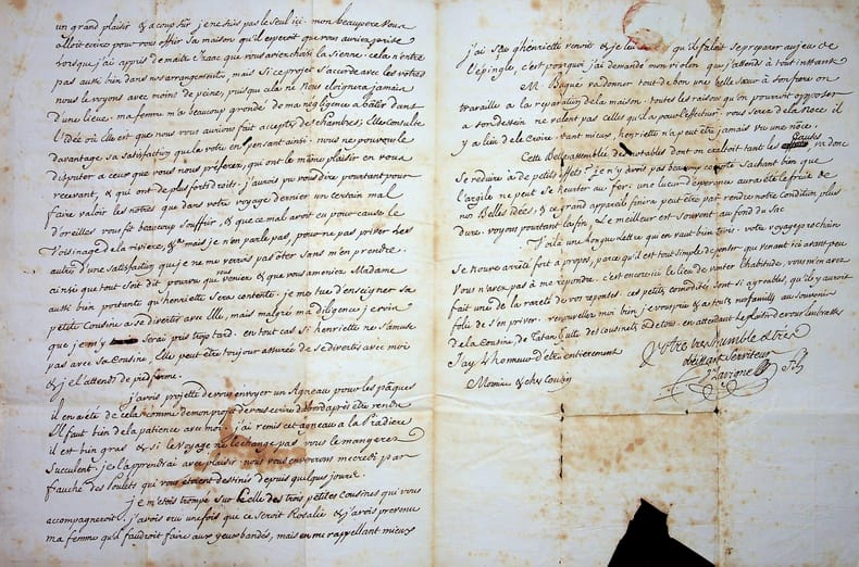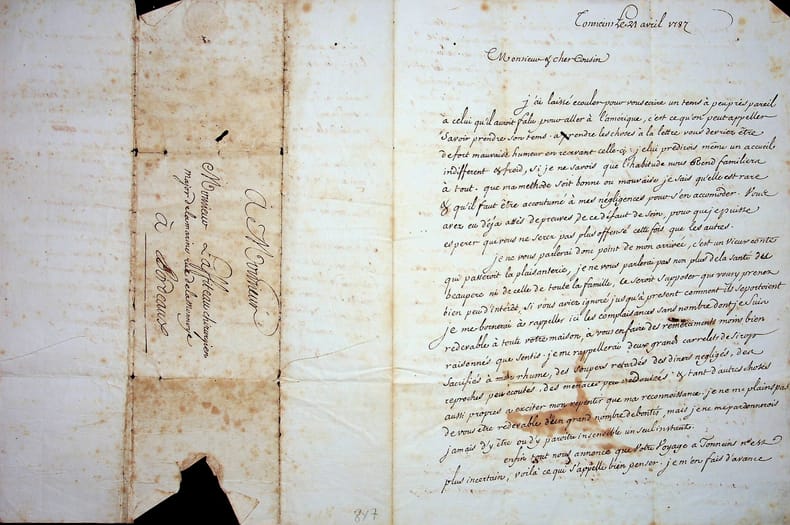 [Tonneins] Jean Lavigne (XVIIIe), vraisemblablement député du Lot-et-Garonne en 1791-1792, peut-être maire de Tonneins de 1830-1835. . L.A.S., Tonneins, 21 avril 1787, 3p in-4. Longue lettre familiale à Jean-Baptiste Laffiteau (ca.1735-1810), chirurgien major de la marine à Bordeaux. Jean Lavigne avait épousé, un an plus tôt, Marie Laffiteau (1765-?). Jean-Baptiste est probablement un oncle de Marie. Un Lavigne sera maire de Tonneins au XIXe et il est possible que ce soit notre expéditeur. Document un peu fragilisé aux plis. [476]