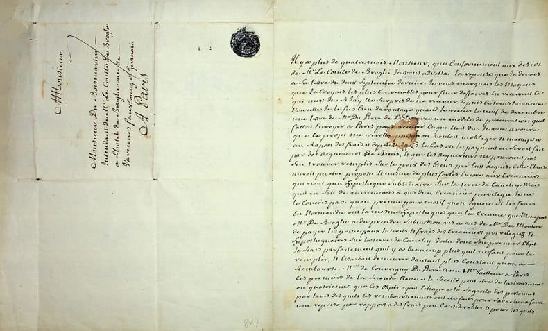 François-Paul de Launay d'Eterville (1703-1769), seigneur d'Eterville (Calvados), conseiller à la cour des comptes, aides et finances de Normandie. L.A.S. « D'Esterville », Eterville, 16 janvier 1766, 2p in-4. A Guy-Michel du Boismartin [Dubois-Martin] (ca.1730-1792), intendant et secrétaire du comte de Broglie, Charles-François de Broglie (1719-1781). Longue lettre à propos d'une affaire entre le comte de Broglie et M. du Perre de l'Isle (?), de la terre de Cauchy et d'une hypothèque sur cette terre. Joli cachet de cite armorié au dos. [476]