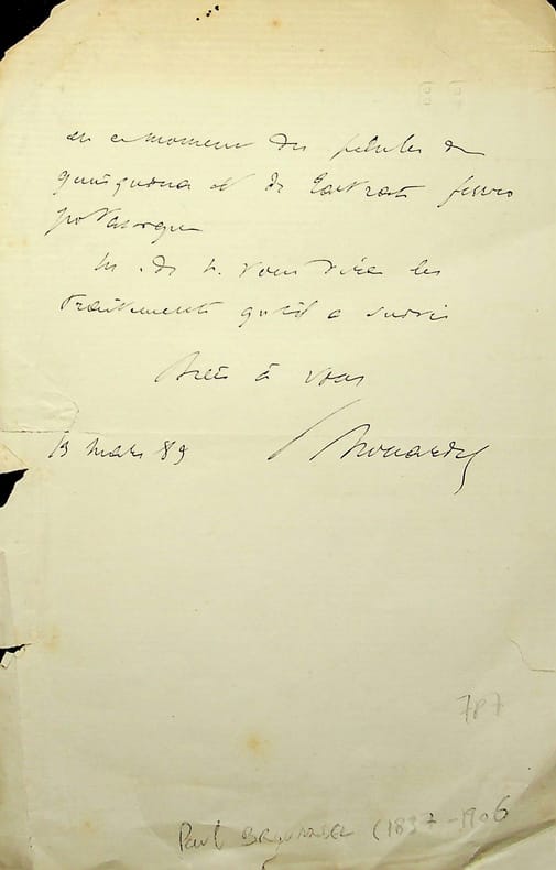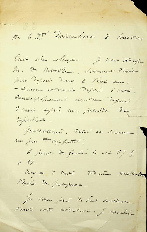 Paul Brouardel (1837-1906), médecin légiste, membre de l'Académie de Médecine. L.A.S., 13 mars 1883, 1p 1/2 in-8. Au docteur Georges Daremberg (1850-1906). Il lui adresse « M. de Neuville », probablement le peintre Alphonse de Neuville, lui expliquant brièvement le cas et le recommandant. Nombreuses petites déchirures. [476]