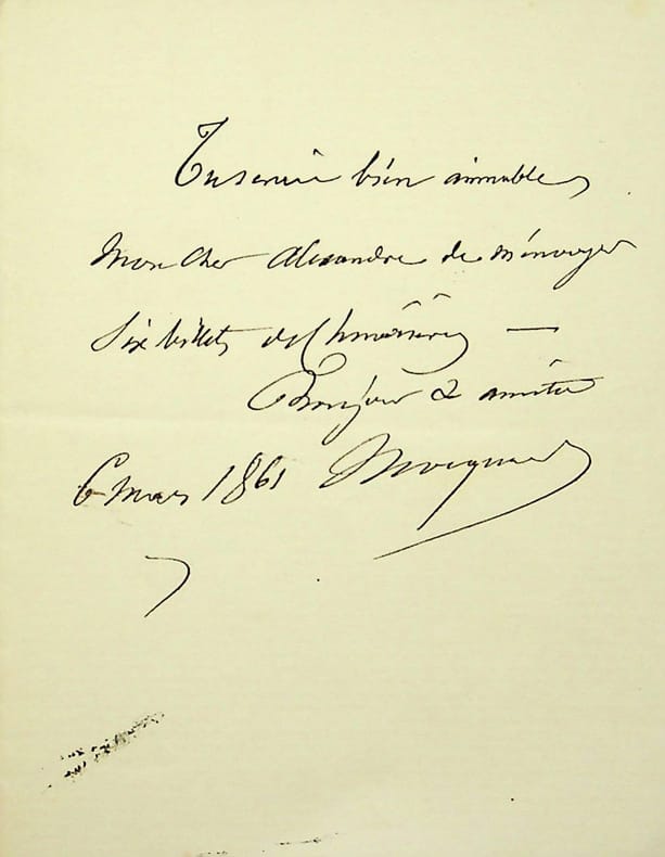 Jean-François Mocquard (1791-1864), écrivain, diplomate, homme politique. L.A.S., 6 mars 1861, 1p in-12. « Tu serais bien aimable, mon cher Alexandre, de m'envoyer six billets de [mot illisible]. Bonjour & amitié. Mocquard ». [476]
