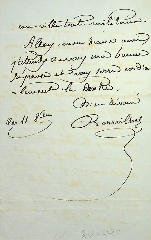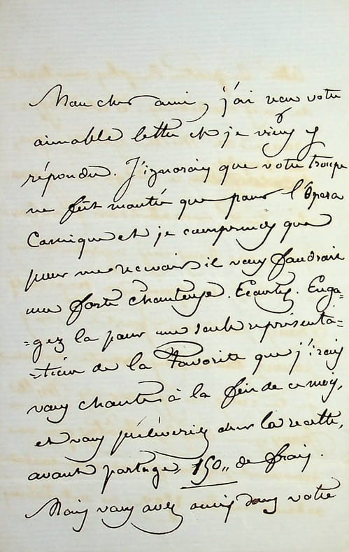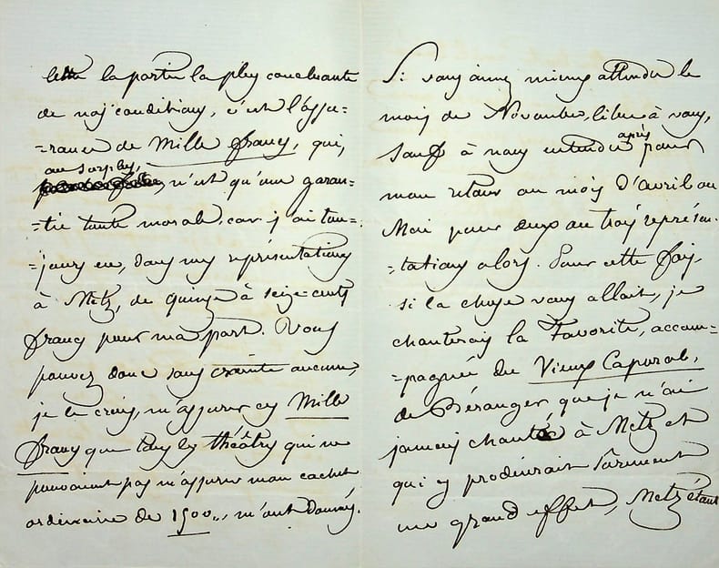 Paul Barroilhet (1805-1871), baryton, collectionneur de tableaux. L.A.S., 11 octobre, 3p 1/2 in-8. Longue lettre à propos de l'organisation de concerts à Metz. Barroilhet y chantera notamment La Favorite de Donizetti. Belle lettre, peu commun. [476]