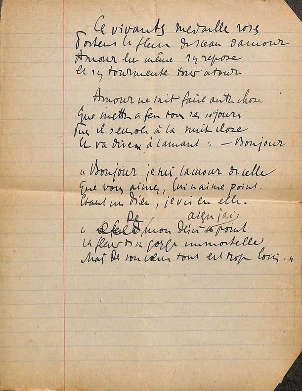 Remarquable poème de jeunesse autographe d'André Breton dédié à Marie Laurencin, intitulé "L'an Suave", 15 vers à l'encre noire sur papier vergé, composé en avril 1914. Notre manuscrit fut rédigé entre mars 1917 et le début de l'année 1918. Notre poème est présenté sous chemise et étui aux plats de papier à motifs abstraits, dos de la chemise de maroquin vert olive, gardes et contreplats de daim crème, feuille de plexiglas souple protégeant le poème, étui bordé de maroquin vert olive, étiquette de papier olive portant la mention "poème autographe" appliquée en pied du premier plat de l'étui, ensemble signé de Thomas Boichot. Poème essentiel de la période pré-dadaïste de l'auteur, il fait partie d'un ensemble cohérent de sept poèmes manuscrits de Breton (désigné sous le nom de coll.X. dans les uvres complètes d'André Breton, tome I de La Bibliothèque de la Pléiade, Gallimard, 1988, p. 1071). Ces poèmes, de sa graphie de jeunesse, sont soigneusement calligraphiés à l'encre noire sur papier vergé filigrané. Cet ensemble a étéadressé à son cercle d'amis et d'écrivains, où figurent notamment Valéry, Apollinaire, Théodore Fraenkel, et son frère d'armes André Paris. Il fut par la suite publié dans son premier recueil, Mont de piété, qui parut en juin 1919 à la maison d'édition Au sans Pareil, nouvellement fondée par son ami René Hilsum. La datation précise de cet ensemble de poèmes autographes est déterminée par l'écriture du dernier poème de la collection («André Derain»),composé le 24 mars 1917, qui offre un terminus post quem absolu. En outre, une version plus ancienne du poème «Age», dédié à Léon-Paul Fargue, figure dans notre collection sous son nom originel «Poème». Daté par l'auteur du 19 février 1916 - le jour de ses vingt ans - et créé 10 jours plus tôt selon sa correspondance, il ne fut rebaptisé et remanié que pour sa publication en juillet 1918 dans Les Trois Roses. Selon toute vraisemblance antérieurs à la parution de ce dernier poème, les sept poèmes autographes furent probablement rédigés courant 1917 ou au début de l'année 1918, alors que Breton poursuit son internat au Val-de-Grâce et fait la rencontre décisive de Louis Aragon. Les poèmes qui constitueront Mont de piété représentent un rare et précieux témoignage de ses influences de jeunesse, à l'aube de son adhésion au mouvement Dada et sa découverte de l'écriture automatique. Assez brefs et parfois sibyllins, on y sent poindre des accents symbolistes empruntés à Mallarmé, qu'il redécouvre lors de matinées poétiques au théâtre Antoine, au Vieux-Colombier, en compagnie de son camarade de lycée Théodore Fraenkel. Durant le premier mois de la guerre, Breton se consacre également à Rimbaud, et se plonge dans Les Illuminations, seul ouvrage emporté dans la confusion et la hâte qui suivit la déclaration de guerre. De ses lectures rimbaldiennes naquirent les poèmes «Décembre», «Age», et «André Derain», tandis qu'il emprunte à Apollinaire sa muse Marie Laurencin à qui il dédie «L'an suave». Par ailleurs, l'héritage poétique de l'auteur sera particulièrement marqué par la figure de Paul Valéry, avec qui il entre en correspondance dès 1914. Valéry joue dans l'écriture des poèmes de Mont de Piété un rôle considérable par l'attention et les conseils qu'il prodigue au jeune poète. Admiratif de l'audace de son disciple, qui lui adressa chacun de ses poèmes, il apprécie le poème «Facon» (1916) en ces termes: «Thème, langage, visée, métrique, tout est neuf, mode future, façon» (Lettre de juin 1916,uvres complètes d'André Breton, tome I de La Bibliothèque de la Pléiade, Gallimard, 1988, p. 1072). Ces fleurons incontournables de la jeunesse de Breton furent composés entre sa dix-septième et vingt-troisième année. Surpris à Lorient par la déclaration de guerre, il devient infirmier militaire, puis officie dans plusieurs hôpitaux et sur le front pendant l'offensive de la Meuse. Il fait à Nantes la connaissance de Jacques Vaché, qui lui inspire un projet d'é