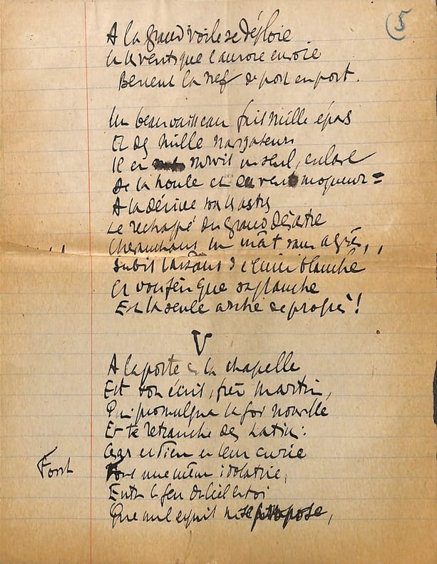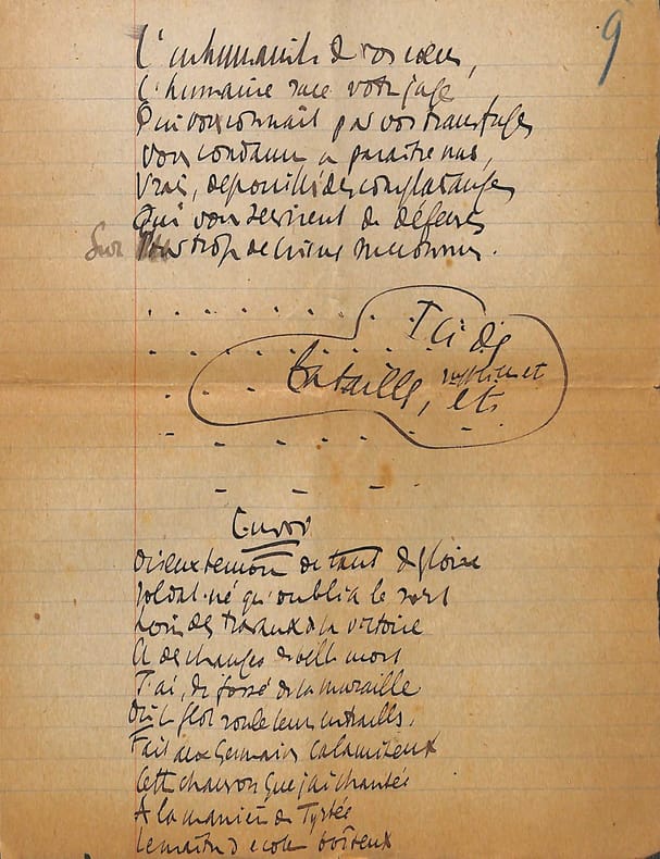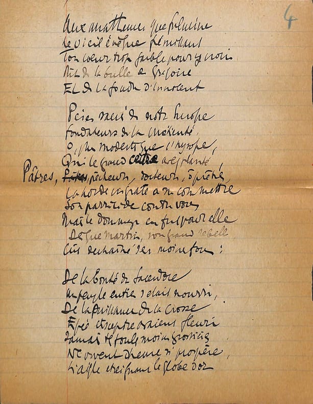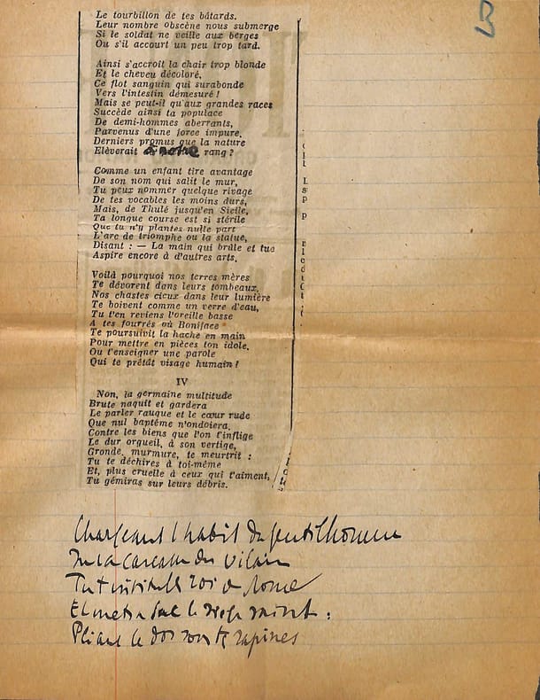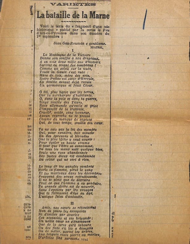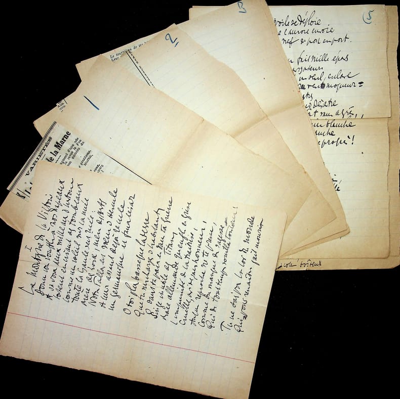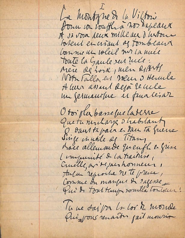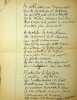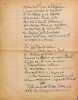 Charles Maurras (1868-1952), poète, écrivain, homme politique, membre de l'Académie française. Poème autographe, sd [ca.1920], 14p in-4. Deux intéressantes copies du poème La Bataille de la Marne, publié le 1er septembre 1918 dans la revue Le Feu. Ce très long poème est, dans sa dernière version, formé de 47 dizains, en sept parties de longueurs inégales et une strophe finale d'envoi. Nos copies sont faites ainsi : -la première copie, entièrement autographe, est constitué de 5p et est bien complète ainsi. Elle contient les 13 premières strophes (parties I et II et début de la partie III). Elle correspond au début du poème. -la seconde copie est constitué de 9p dont un peu plus de 6 sont autographes. Le début est une coupure de journal reproduisant le début du poème (parties I à III et 1ère strophe de la partie IV). La suite est autographe et est la preuve d'un poème retravaillé. Elle contient 13 dizains, repris dans la version définitive mais la partie VI n'a qu'un dizain qui semble être resté inédit et pas de partie VII. Une note de Maurras montre qu'une autre partie devait y être incluse. Le manuscrit se termine avec le dizain d'envoi. Nombreuses variantes avec la version finale. Feuillets jaunis, démontés d'un cahier. Anciennement pliés en 4. Très beau manuscrit. [476]