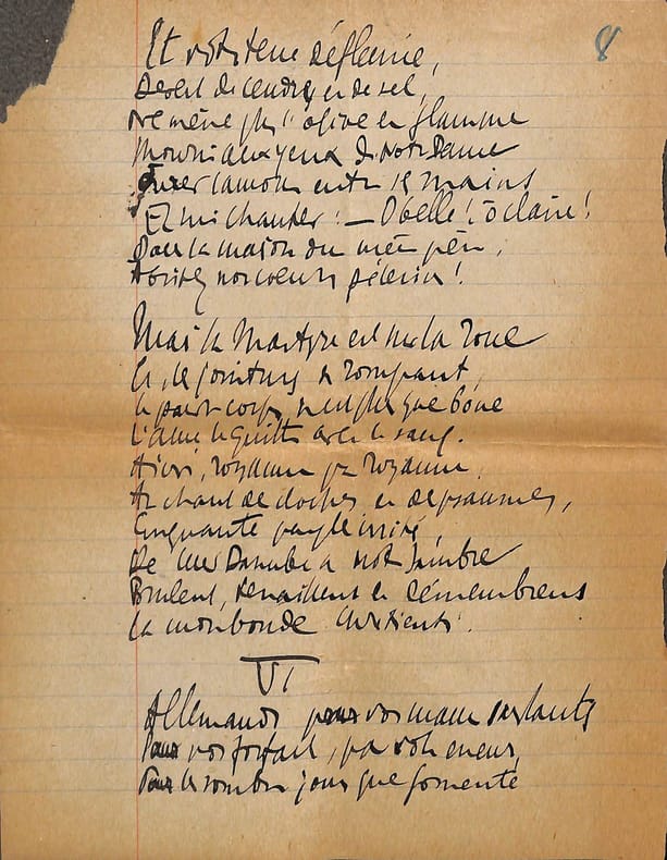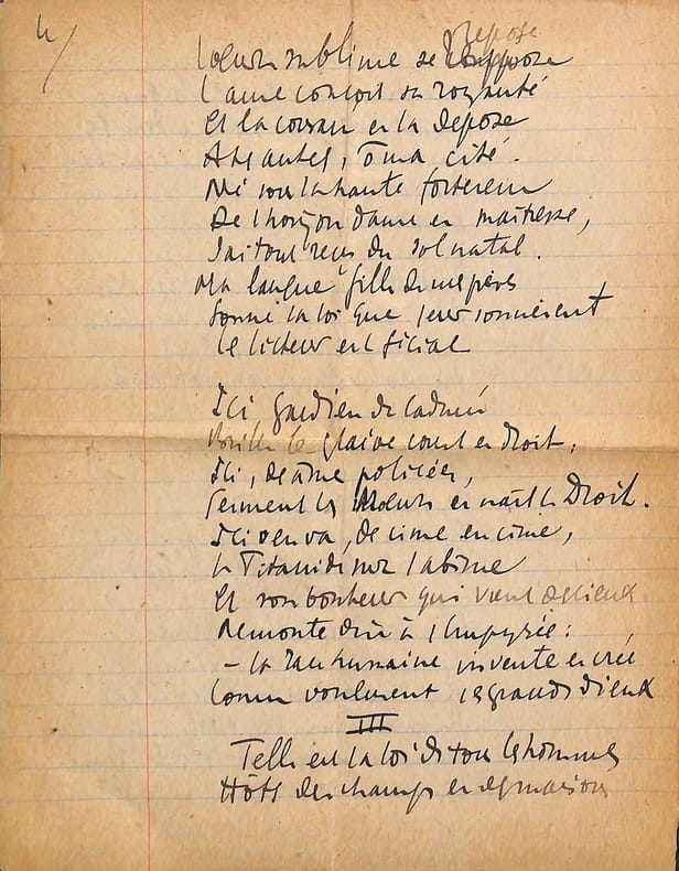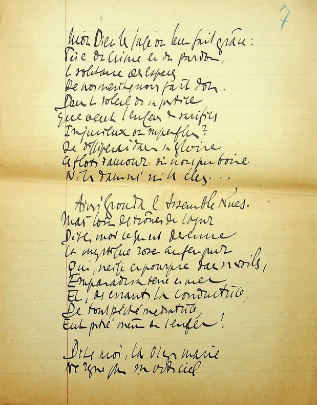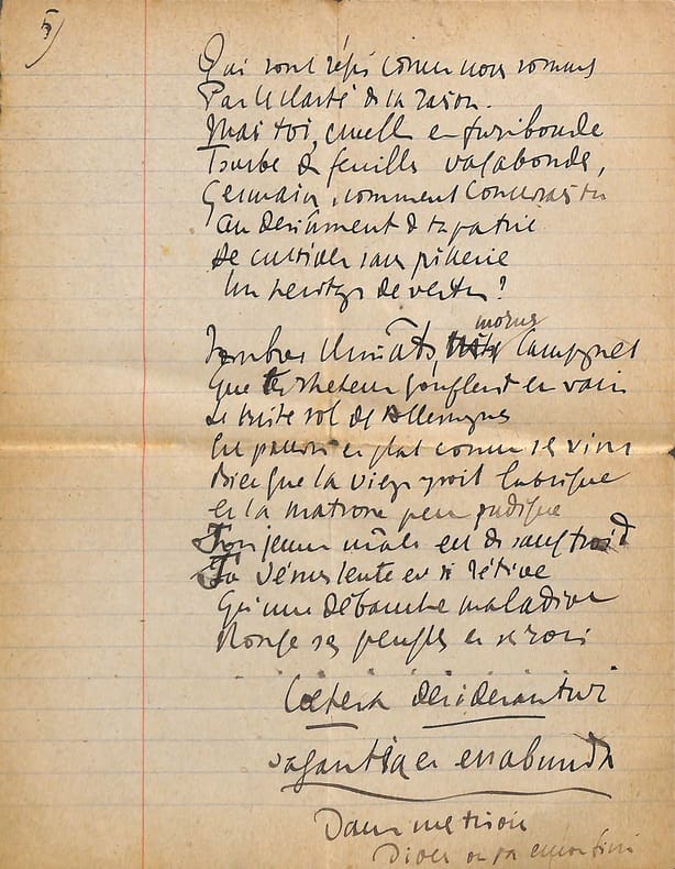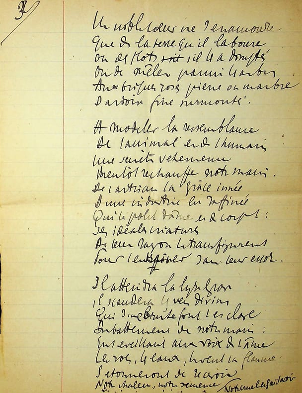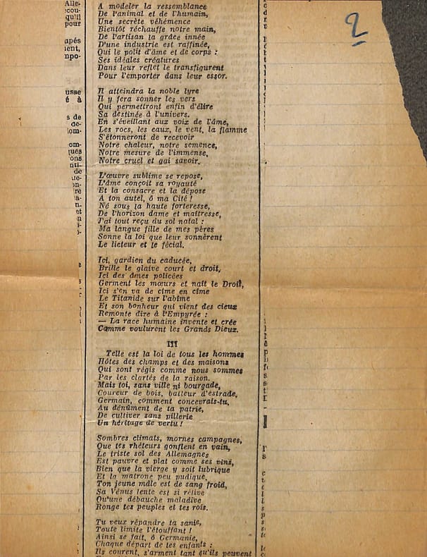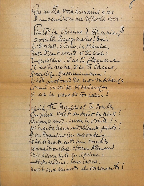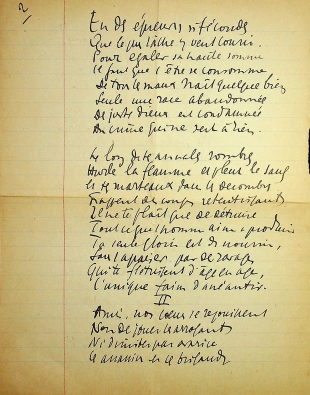 Charles Maurras (1868-1952), poète, écrivain, homme politique, membre de l'Académie française. Poème autographe, sd [ca.1920], 14p in-4. Deux intéressantes copies du poème La Bataille de la Marne, publié le 1er septembre 1918 dans la revue Le Feu. Ce très long poème est, dans sa dernière version, formé de 47 dizains, en sept parties de longueurs inégales et une strophe finale d'envoi. Nos copies sont faites ainsi : -la première copie, entièrement autographe, est constitué de 5p et est bien complète ainsi. Elle contient les 13 premières strophes (parties I et II et début de la partie III). Elle correspond au début du poème. -la seconde copie est constitué de 9p dont un peu plus de 6 sont autographes. Le début est une coupure de journal reproduisant le début du poème (parties I à III et 1ère strophe de la partie IV). La suite est autographe et est la preuve d'un poème retravaillé. Elle contient 13 dizains, repris dans la version définitive mais la partie VI n'a qu'un dizain qui semble être resté inédit et pas de partie VII. Une note de Maurras montre qu'une autre partie devait y être incluse. Le manuscrit se termine avec le dizain d'envoi. Nombreuses variantes avec la version finale. Feuillets jaunis, démontés d'un cahier. Anciennement pliés en 4. Très beau manuscrit. [476]