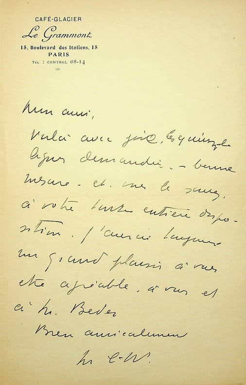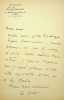 Pensée et courrier adressés à Léon Lang.Léon Lang, fondateur de la Société Godefroy Engelmann à Mulhouse, a demandé à divers artistes une pensée personnelle signée sur lart et un portrait de lartiste en vue dune exposition. Nous vous proposons ici cette pensée accompagnée d'une lettre autographe de 2 feuillets écrits au recto uniquement, reproduction d'un portrait de l'artiste en photographie jointe.