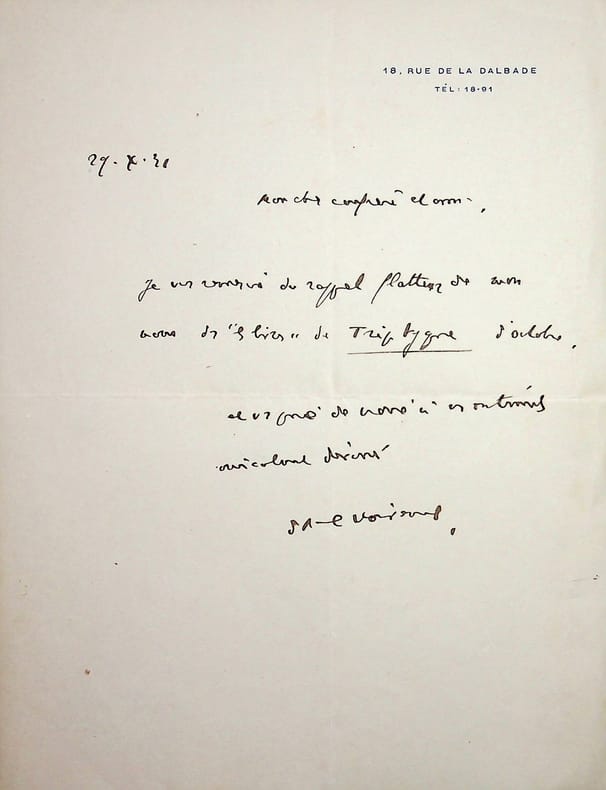 Auguste Gilbert de Voisins (1877-1939), écrivain. L.A.S., 29 octobre 1931, 1p in-8. Remerciements pour une critique. [477]