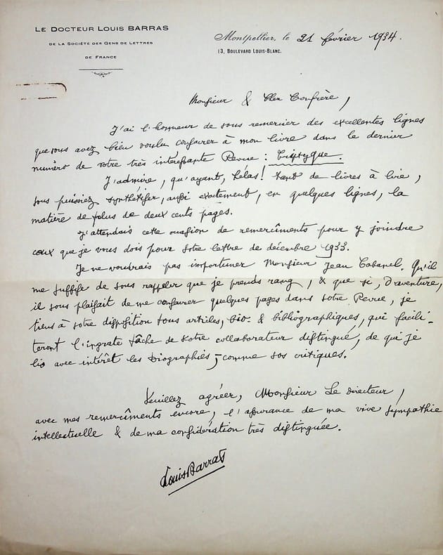 Louis Barras (XXe), médecin, écrivain. L.A.S., Montpellier, 21 février 1934, 1p in-4. Belle lettre de remerciements pour la critique de son livre L'Ecole des Fiancés parue dans la revue Triptyque de janvier 1934. [477]