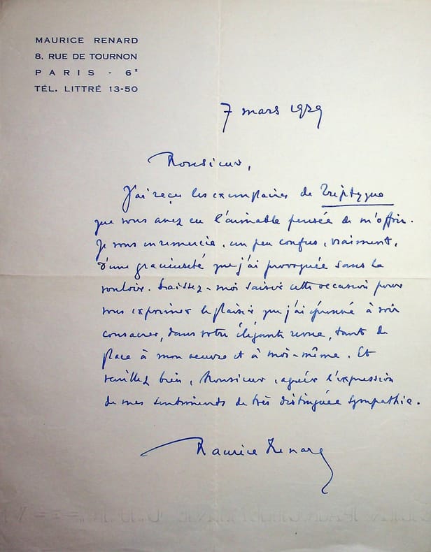 Maurice Renard (1875-1939), écrivain. L.A.S., 7 mars 1929, 1p in-4. Belle lettre de remerciements pour l'envoi de numéros de la revue Triptyque et pour un article à son sujet. Peu commun. [477]