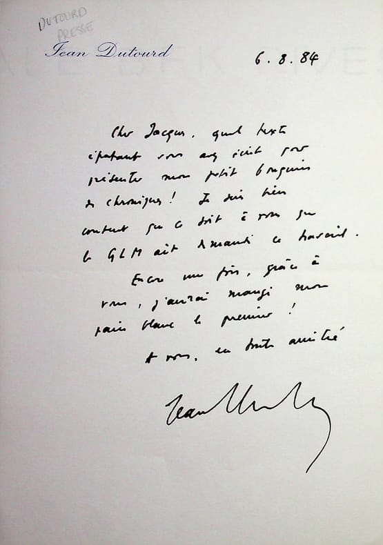 Jean Dutourd (1920-2011), écrivain, membre de l'Académie française. L.A.S., 6 août 1984, 1p in-8. A l'écrivain Jacques Brenner (1922-2001). Belle lettre de remerciements pour un article sur un « petit bouquin de chroniques ». [477]
