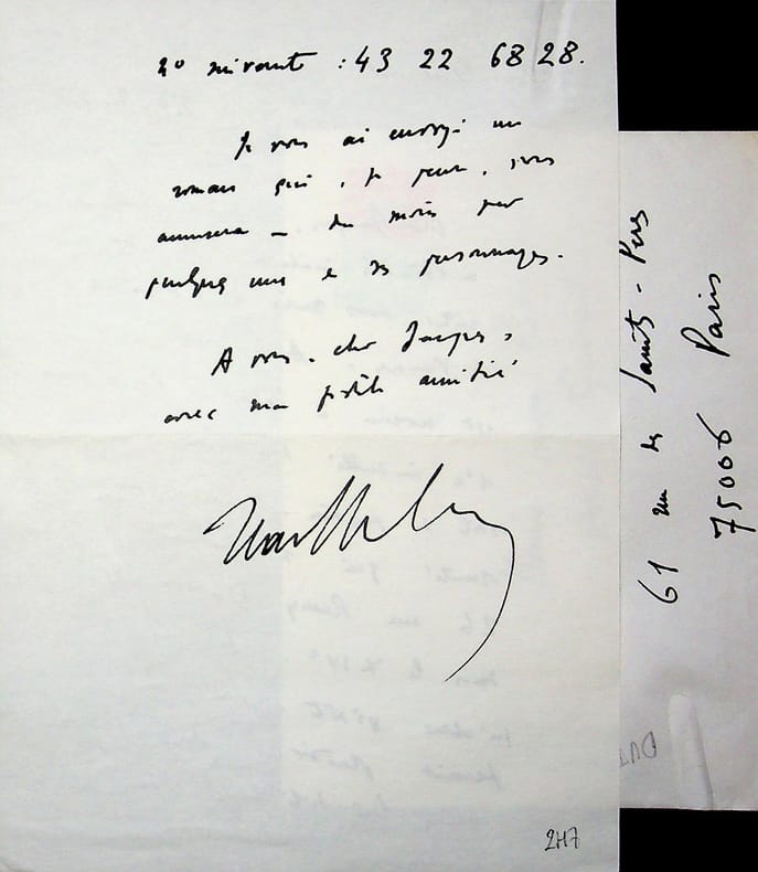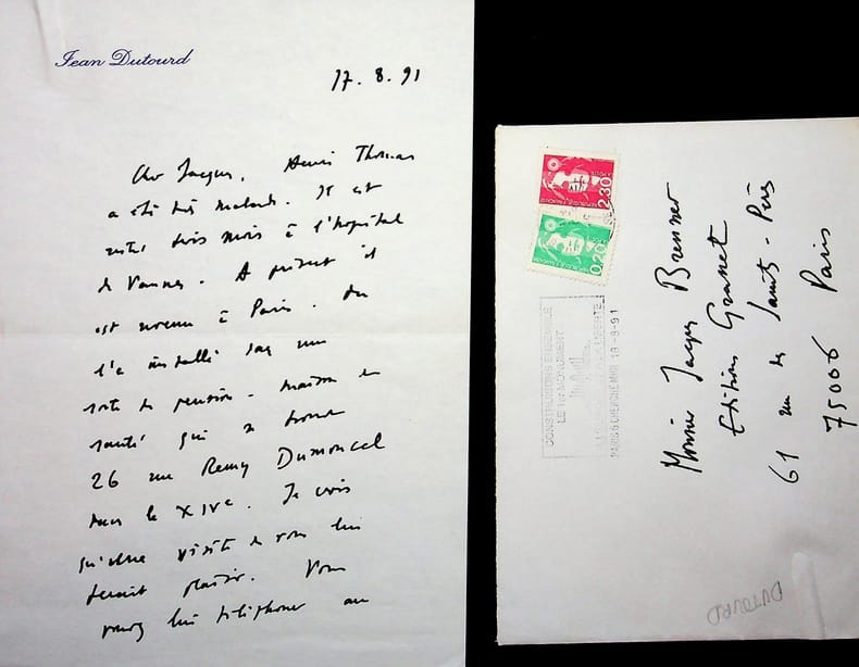 Jean Dutourd (1920-2011), écrivain, membre de l'Académie française. L.A.S.+enveloppe, 17 août 1991, 1p 1/2 in-8. A l'écrivain Jacques Brenner (1922-2001). Belle lettre à propos d'Henri Thomas (1912-1993) qui a été malade et est revenu à Paris en convalescence. Dutourd lui indique qu'une visite ferait plaisir à Thomas. Dutourd ignore alors que Brenner et Thomas sont brouillés. [478]