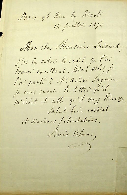 Louis Blanc (1811-1882), écrivain, historien, homme politique. L.A.S., 14 juillet 1872, 1p in-8. Au mathématicien et homme politique Charles-Ange Laisant (1841-1920). « Mon cher Monsieur Laisant, J'ai lu votre travail. Je l'ai trouvé excellent. Bien vite, je l'ai porté à Mr André Sagnier. Je vous envoie la lettre qu'il m'écrit et celle qu'il vous adresse. Salut bien cordial et sincères félicitations. Louis Blanc ». André Sagnier est un éditeur. Il est alors probablement intéressé par un travail politique de Laisant. [478]