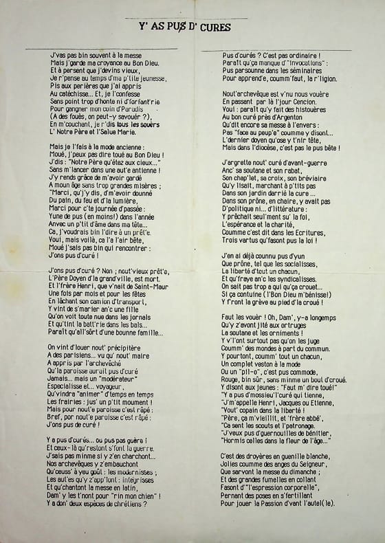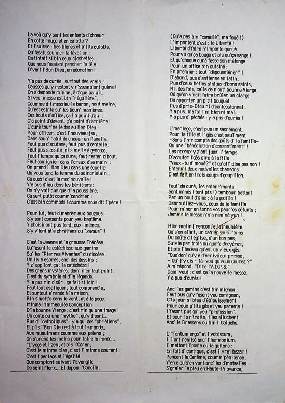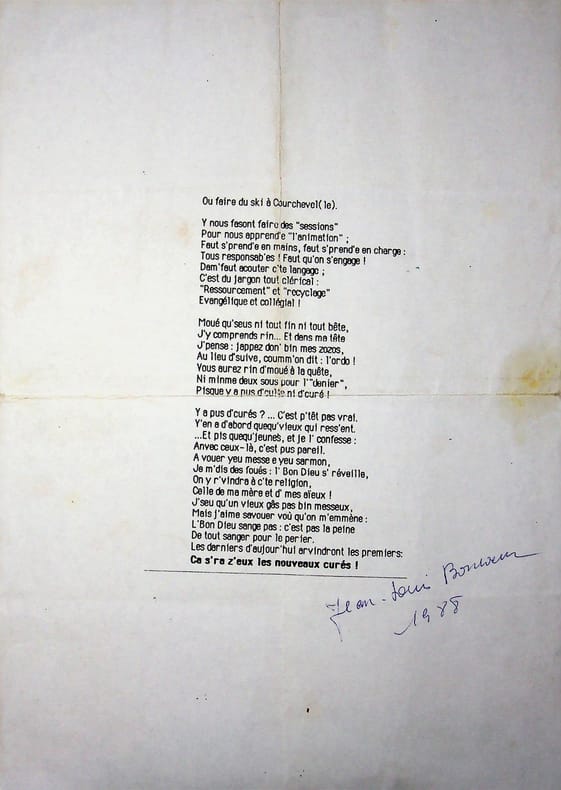 Jean-Louis Boncoeur (1911-1997), écrivain berrichon, conteur, comédien. Poème signé, 1988, 3p in-4. Long poème en berrichon titré « Y'as pus d'curés », signé « Jean-Louis Boncoeur 1988 ». Plis anciens, feuilles un peu affaiblies au pli central. [478]