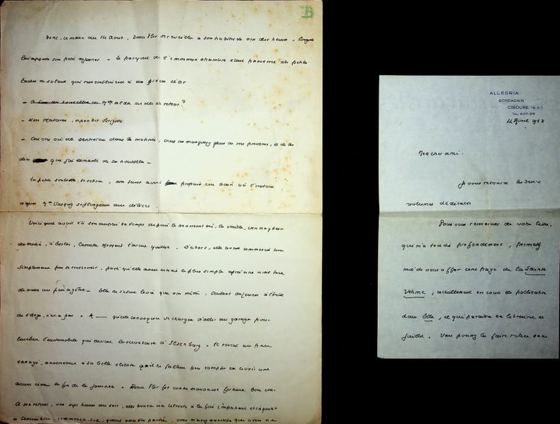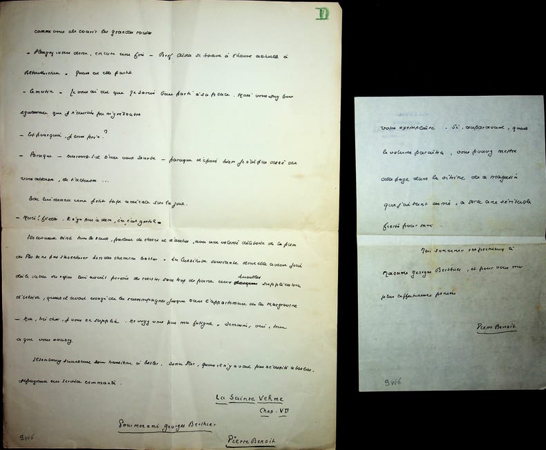 Pierre Benoit (1886-1962), écrivain, membre de l'Académie française. Manuscrit A.S., sd [14 avril 1958],2p in-folio. 2 pages du manuscrit de son roman La Sainte Vehme, publié en 1958, tirée du chapitre VII, correspondant aux pages 164 à 169 du roman. Il s'agit en revanche d'une première version, différant légèrement de la version publiée. Ce manuscrit est dédicacé « pour mon ami Georges Berthier ». Il s'agit probablement de l'écrivain qui eut le prix Montyon en 1960. On joint la lettre d'envoi, datée du 14 avril 1958, 2p in-8. Il annonce l'envoi du manuscrit et signale que le livre est alors publié en feuilleton dans Elle et sera publié en juillet. Beau manuscrit. [478]