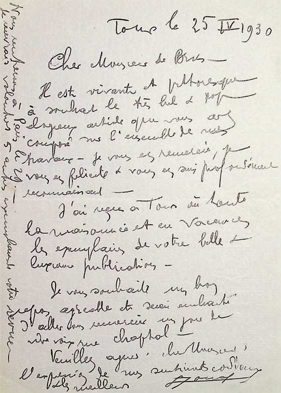 Lucien Jonas (1880-1947), peintre, second grand prix de Rome 1905, dessinateur pour les billets de banque. L.A.S., Tours, 25 avril 1930, 1p in-12. À M. de Brus. Belle lettre de remerciements pour l'article qui lui est consacré. [478]