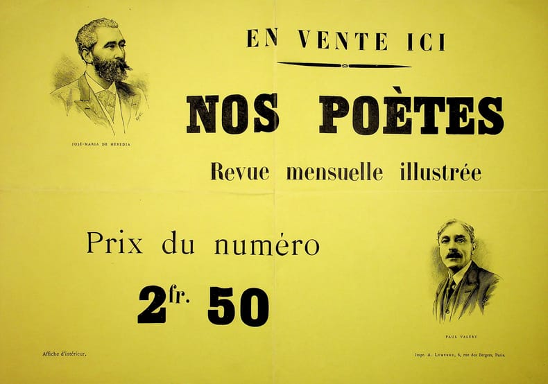[Paul Valéry & José-Maria de Heredia]. Affichette, 1924, 240*345mm. Rare « affiche d'intérieur » pour la revue « Nos poètes, Revue mensuelle illustrée », publiée de 1924 à 1926. Elle est imprimée sur papier jaune par Lemerre et porte les portraits de Valéry et Heredia. Pliée en 4 (et conservée pliée en 2). Rare document anecdotique. [478]