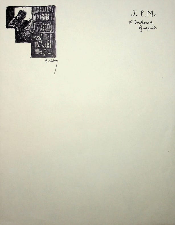 Julien-Pierre Monod (1879-1963), banquier, bibliophile, ami de Paul Valéry. Papier à lettre vierge, 1p in-4. Avec u n dessin, représentant probablement Monod dans sa bibliothèque, et la signature de Paul Valéry. Sympathique document. [478]