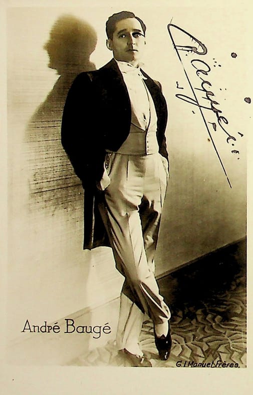 André Baugé (1893-1966), baryton, acteur de cinéma. Photographie signée, sd [années 20?]. Photographie format carte postale portant sa signature à l'encre sur le côté. [478]