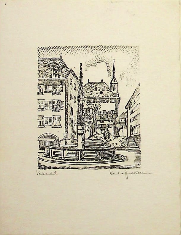 [Suisse, Bâle, Basel] Kaufmann. Gravure originale signée, sd, environ 110*85mm. Petite vue de la vieille ville de Bâle. 4p avec au centre message de voeux. [479]