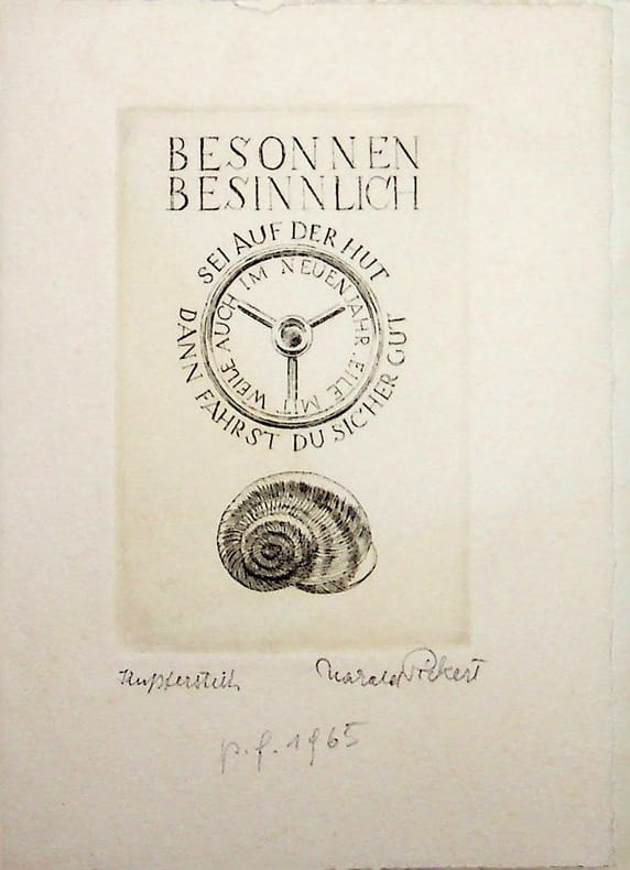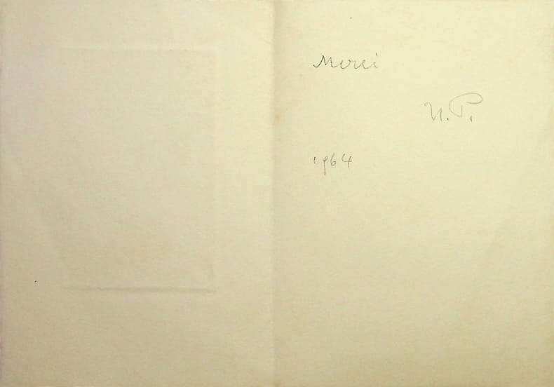 Harald Pickert (1901-1983), graveur autrichien. Eau-forte signée, 1964, environ 135*95mm. Gravure, portant la mention Kupferstich (gravure sur cuivre) et signée. A l'intérieur, court message autographe « Merci HP 1964 ». [479]