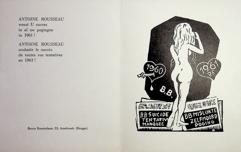 [Brigitte Bardot] Antoine Rousseau (XXe), graveur belge, de Brugge. Gravure sur bois, 1961, environ 140*220mm. Carte de voeux, en français et flamand, pleine d'humour noir : faisant référence à la tentative de suicide de Bardot le 18 septembre 1960, il souhaite « le succès de toutes vos tentatives en 1961 ». [479]