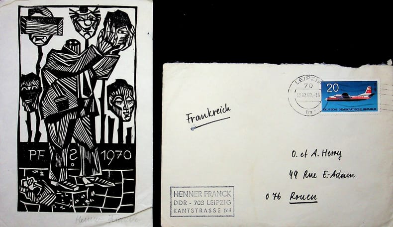 Henner Franck (XXe), graveur allemand. Gravure sur bois signée, 1969, environ 160*105mm. Gravure, probablement pour des voeux pour 1970. Avec enveloppe d'envoi. [479]