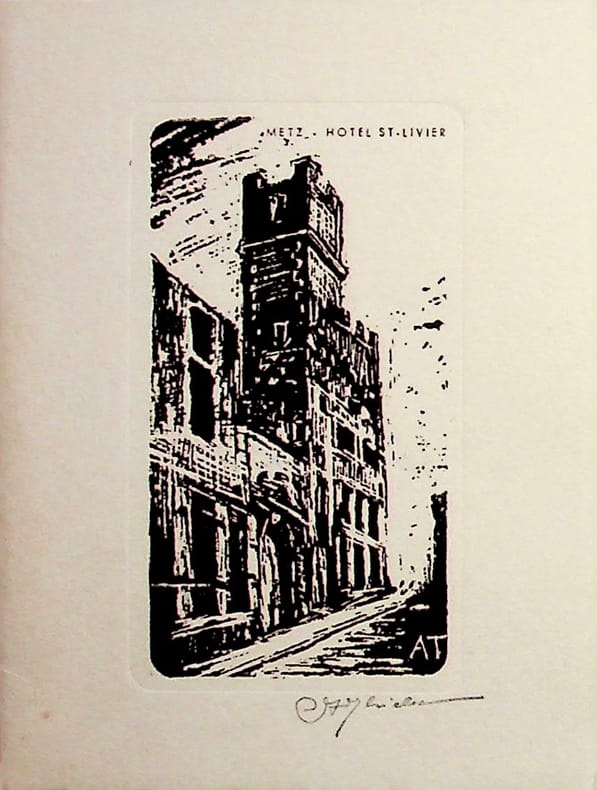 [Metz] Adolphe Thielen (1902-1974), graveur originaire de Moselle. Gravure signée, 1959, environ 115*85mm. Gravure représentant l'hôtel Saint Livier à Metz. A l'intérieur : invitation à un dîner de Noël avec le menu. [479]
