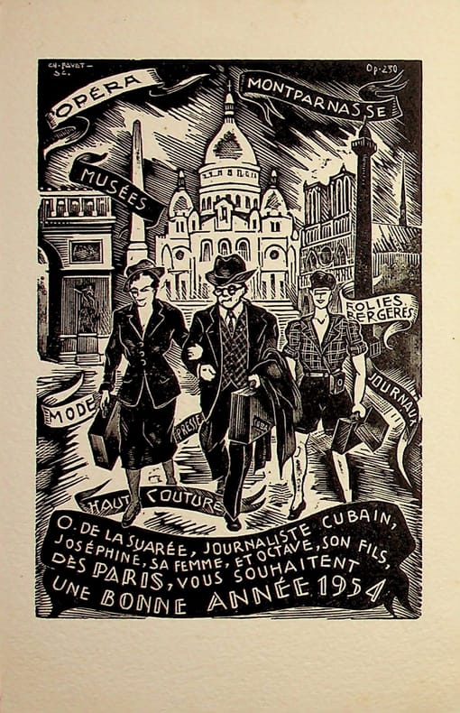 Charles Favet (1899-1982), dessinateur, graveur sur bois. Gravure sur bois, 1954, environ 165*110mm. Carte de voeux pour la famille de La Suarée. [479]