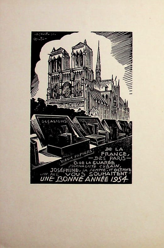Charles Favet (1899-1982), dessinateur, graveur sur bois. Gravure sur bois, 1954, environ 150*100mm. Carte de voeux pour la famille de La Suarée. [479]