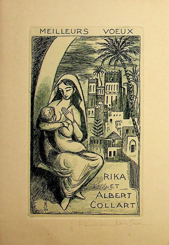 Julio Fernandez-Saez (XXe), artiste espagnol. Gravure signée, sd, environ 150*105mm. Carte de voeux pour Rika et Albert Collart (Belgique). [479]