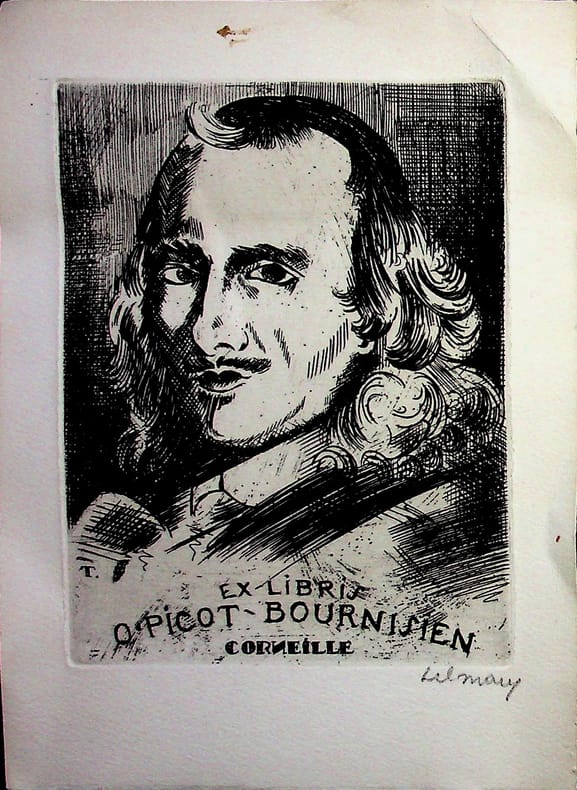 Emile-Henry Tielemans dit Tilmans (1888-1960), artiste belge, graveur. Gravure signée, sd, environ 185*135mm. Ex-libris pour Odile Picot-Bournisien représentant Corneille. Pli angulaire. [479]