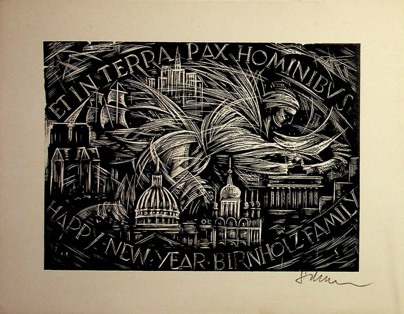Hans Schulze (1904-1982), graveur allemand. Gravure signée, sd, environ 140*180mm. Carte de voeux pour la famille Birnholz. [479]