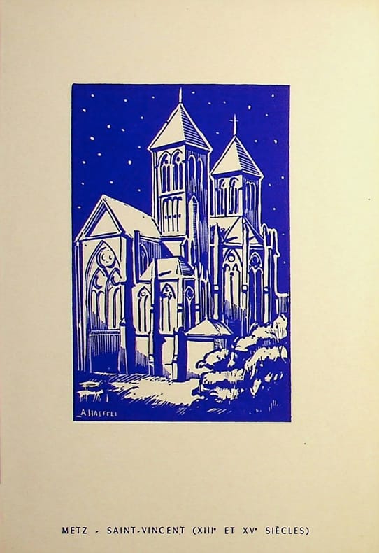 Albert Haefeli (1909-1987), artiste lorrain. Gravure sur bois, sd, environ 150*100mm. Carte de voeux du couple Haefeli représentant l'église Saint Vincent à Metz. [480]