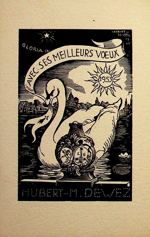 Charles Favet (1899-1982), dessinateur, graveur sur bois. Gravure sur bois, 1953, environ 125*80mm. Jolie carte de voeux de Hubert-M Dewez (Belgique) pour 1953. [480]