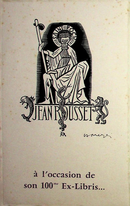 Daniel Meyer (1908-1993), graveur alsacien. Gravure sur bois signée, 1955, environ 150*95mm. Invitation pour fêter la réalisation de son 100e ex-libris, qu'il représente donc au recto (ex-libris de Jean Rousset avec Saint Roch). [480]