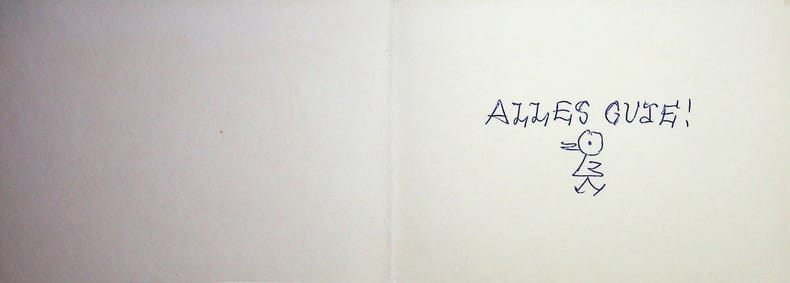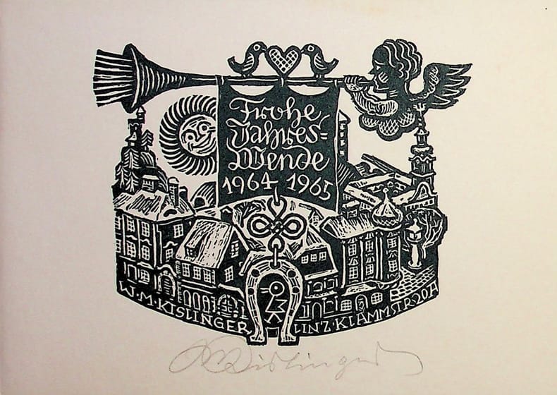 Max Kislinger (1895-1983), artiste autrichien, graveur. Gravure sur bois signée, 1965, environ 105*150mm. Carte de voeux avec un petit mot à l'intérieur « Alles Gute » et le petit dessin servant de signature. [480]