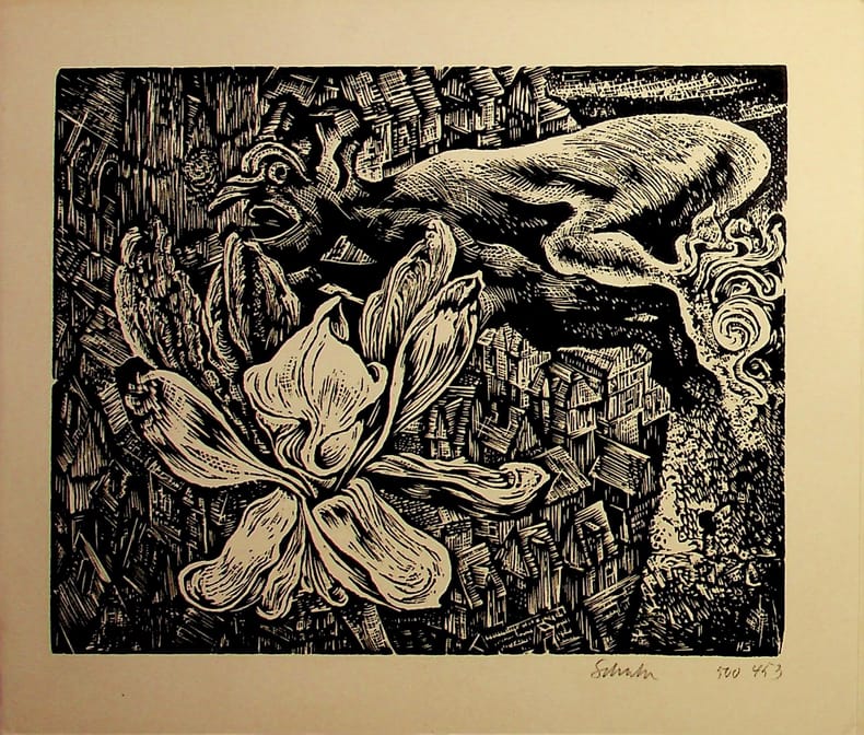 Hans Schulze (1904-1982), graveur allemand. Gravure sur bois signée, sd, environ 150*175mm. Carte de voeux. [480]