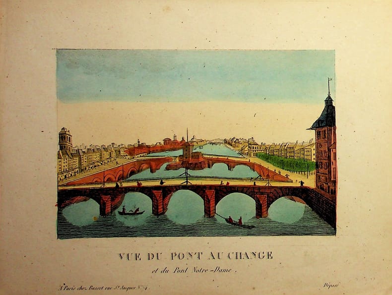 [Vue d'optique, Paris] Vue du pont au change et du pont Notre-Dame. Gravure aquarellée, Paris, Basset, ca.1820, environ 160*205mm. Jolie gravure, probablement sur acier. [481]