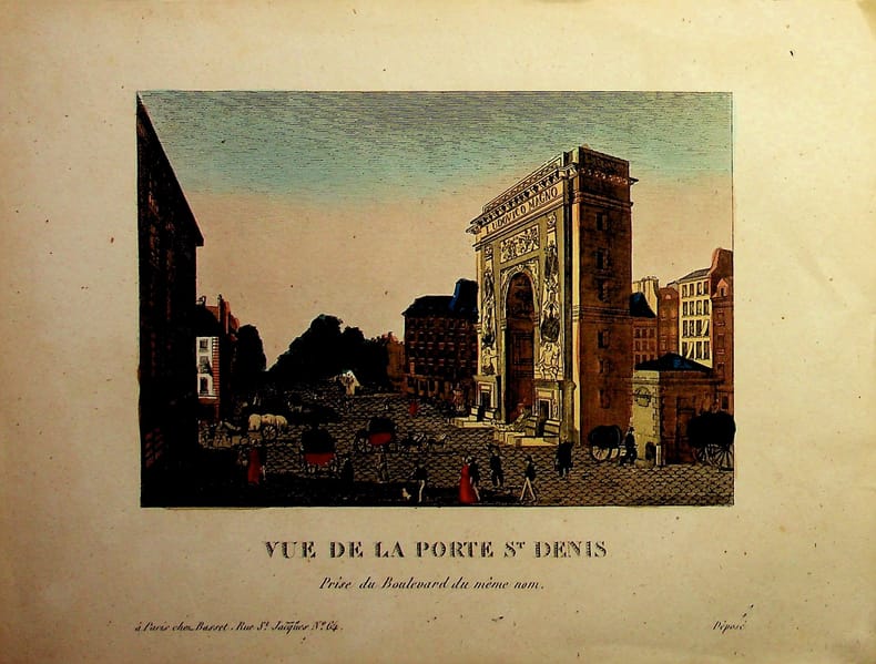 [Vue d'optique, Paris] Vue de la porte Saint Denis prise du boulevard du même nom. Gravure aquarellée, Paris, Basset, ca.1820, environ 160*205mm. Jolie gravure, probablement sur acier. [481]