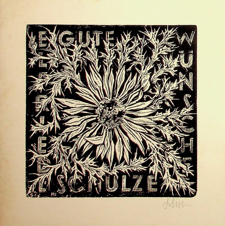 Hans Schulze (1904-1982), graveur allemand. Gravure signée, sd, environ 135*135mm. Carte de voeux. [481]